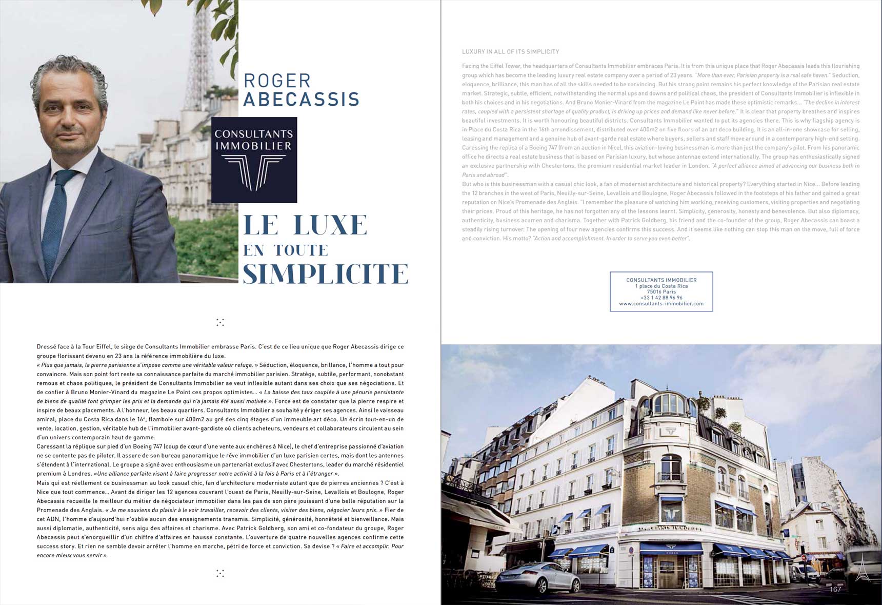 Mais qui est réellement ce businessman au look casual chic, fan d’architecture moderniste autant que de pierres anciennes ? C’est à Nice que tout commence… Avant de diriger les 12 agences couvrant l’ouest de Paris, Neuilly-sur-Seine, Levallois et Boulogne, Roger Abecassis recueille le meilleur du métier de négociateur immobilier dans les pas de son père, jouissant d’une belle réputation sur la Promenade des Anglais. « Je me souviens du plaisir à le voir travailler, recevoir des clients, visiter des biens, négocier leurs prix. » Fier de cet ADN, l’homme d’aujourd’hui n’oublie aucun des enseignements transmis. Simplicité, générosité, honnêteté et bienveillance. Mais aussi diplomatie, authenticité, sens aigu des affaires et charisme. Avec Patrick Goldberg, son ami et co-fondateur du groupe, Roger Abecassis peut s’enorgueillir d’un chiffre d’affaires en hausse constante. L’ouverture de quatre nouvelles agences confirme cette success story. Et rien ne semble devoir arrêter l’homme en marche, pétri de force et conviction. Sa devise ? « Faire et accomplir. Pour encore mieux vous servir ».
