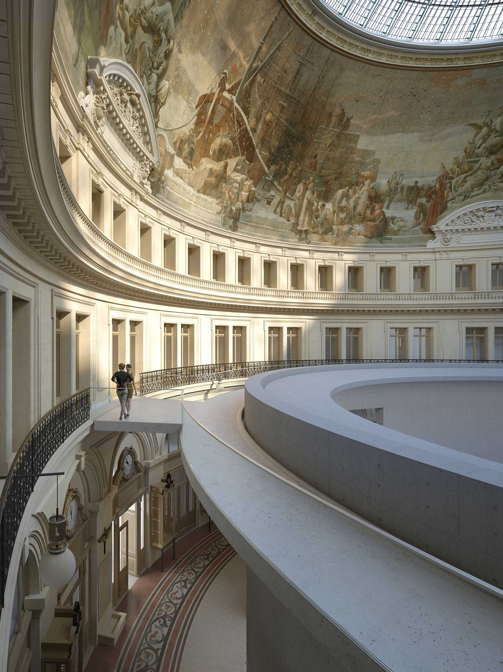 Fresque-promenoir à 360 degrés. Après s’être faufilé dans les espaces de circulation extérieurs lovés entre le mur en béton et la façade intérieure historique d’Henri Blondel (1821-1897). On grimpe les escaliers jusqu’au niveau le plus élevé du cylindre. Là un promenoir domine l’espace central et donne une vue rapprochée sur l’anneau de peinture de la coupole. Une fresque murale qui s’étend sur 1 400 mètres carrés (140 mètres de long et 10 de haut), exécutée par cinq artistes en 1889. Elle représente une allégorie du commerce français dans tous les continents, au temps des colonies. Pour redonner son lustre d’antan à ce panorama de toiles marouflées déployé à 360 degrés. 24 restauratrices ont travaillé d’arrache-pied pendant 6 mois. Sous la houlette d’Alix Laveau et de Pierre-Antoine Gatier. Architecte en chef des monuments historiques (ACMH), fameux spécialiste de la réhabilitation du patrimoine.