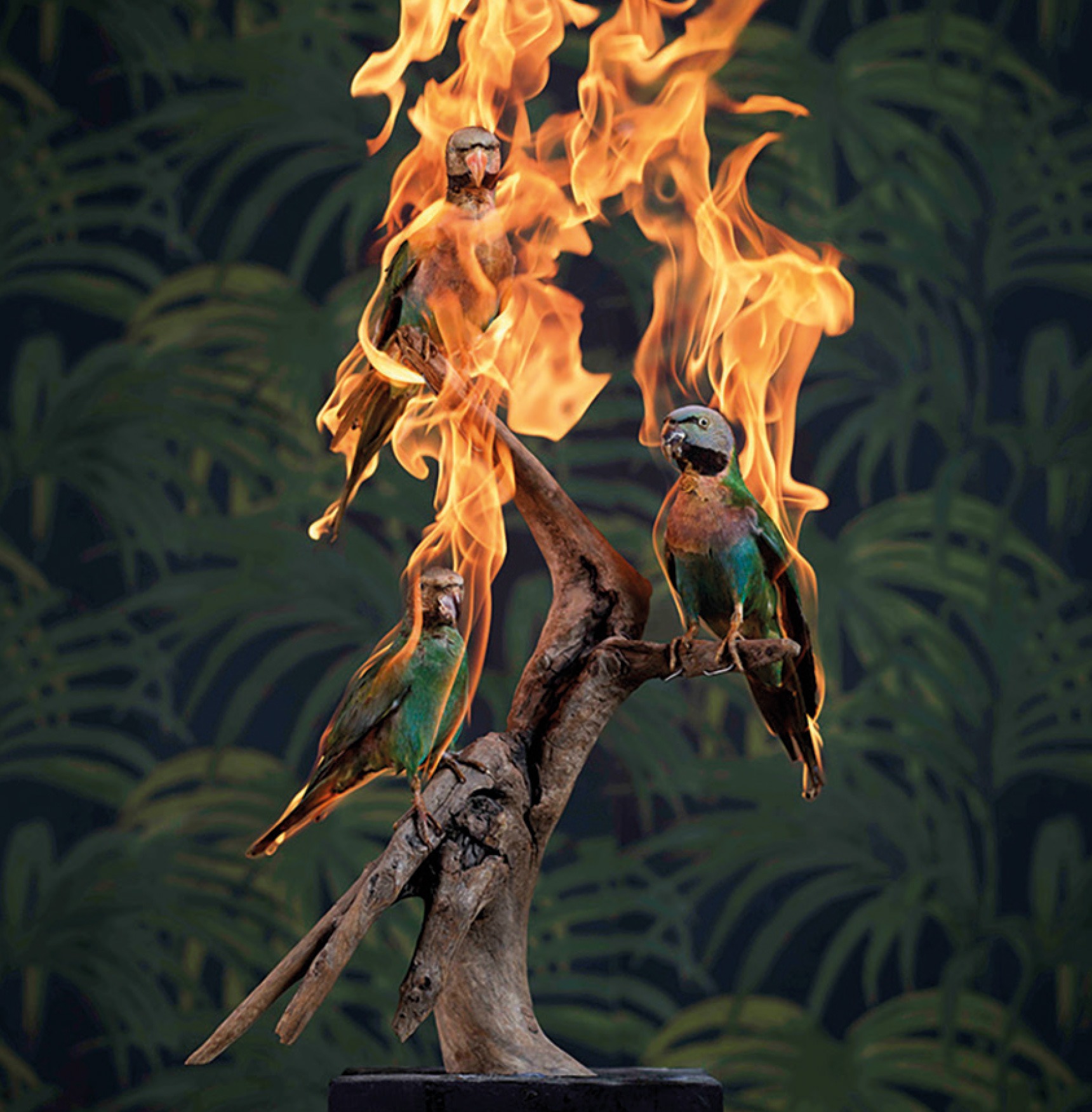 Incendie. Exposée cette année à Stockholm, à Oslo, et sous les cimaises de la galerie Omnius à Arles, pendant le festival de la photographie, la série « Residence of Impermanence » ne se limite pas au seul dramatique et spectaculaire incendie de plusieurs trophées de chasse et de corps d’animaux taxidermisés. Au-delà de la flamboyante destruction de cadavres d’ours, de perroquets, de serpents, de zèbre et d’antilope… la mise en scène d’une combustion photographique réglée au millimètre vise un autre objectif selon son auteur : le paradoxe de redonner vie, l’espace d’un court instant, à ces animaux empaillés, leur offrir un nouveau moment de vitalité, leur accorder un bref moment de gloire, durant lequel ils semblent alors « ressuscités » avant d’être finalement « libérés » dans un certain sentiment de paix.