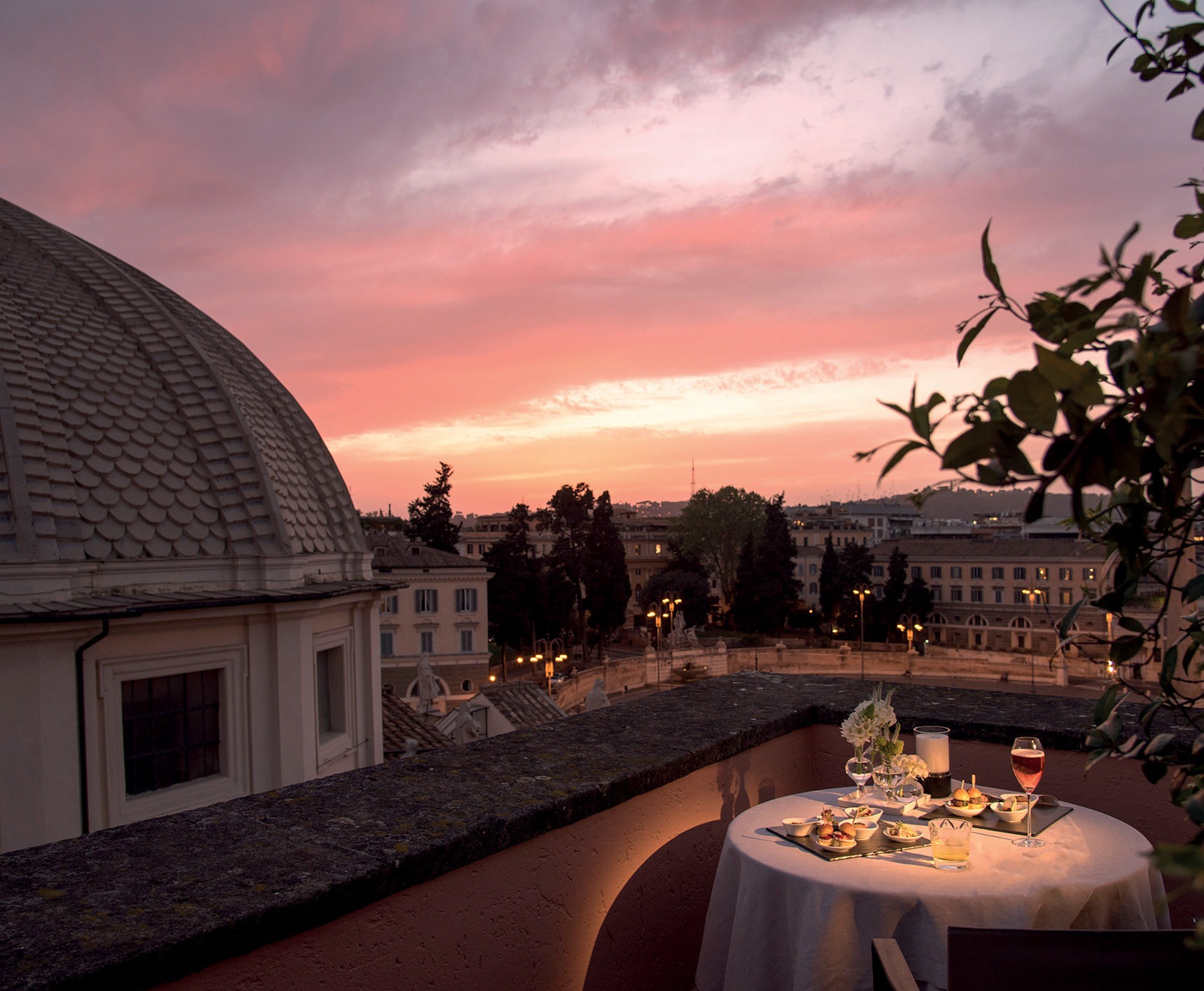 On y sirote le « Spritz maison » sur la terrasse du Bar Stravinskij. Et l’on savoure dans les hauteurs l’excellence de la gastronomie italienne tout en admirant à l’abri du soleil sous les orangers les tons rose et ocre des murs patinés. Les chambres élaborées par Olga Polizzi et l’architecte, Tommaso Ziffer, sont un mélange d’opulence, d’art déco et de Rome antique. Ils conjuguent à souhait coussins graphiques, meubles aux touches barocco design, marbre veiné et mosaïque de couleurs malachite. Chaque espace recèle d’objets soigneusement sélectionnés, créant une esthétique unique. Telles les sublimes suites, Picasso et Nijinski, véritables hommages aux artistes, qui possèdent en outre les terrasses les plus prisées avec vue imprenable sur les toits de la ville. Dans cette oasis de fraîcheur, l’expérience des thermes, dotés d’une piscine à jets d’eau mer où l’on se prélasse sous le plafond bleu étoilé de l’espace wellness, donne à jamais l’envie de devenir romain.
