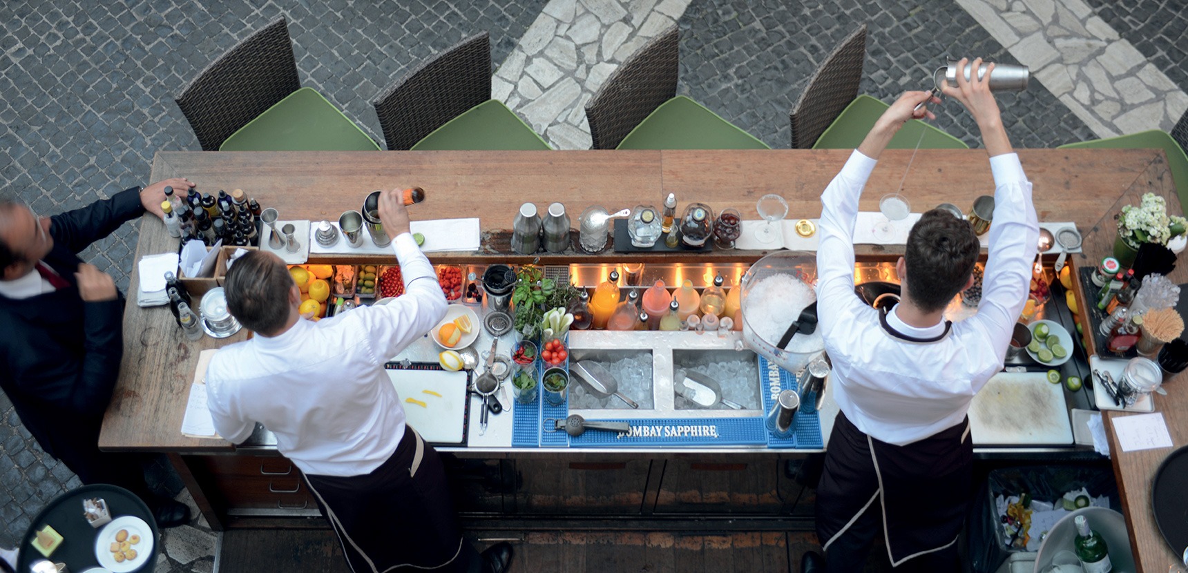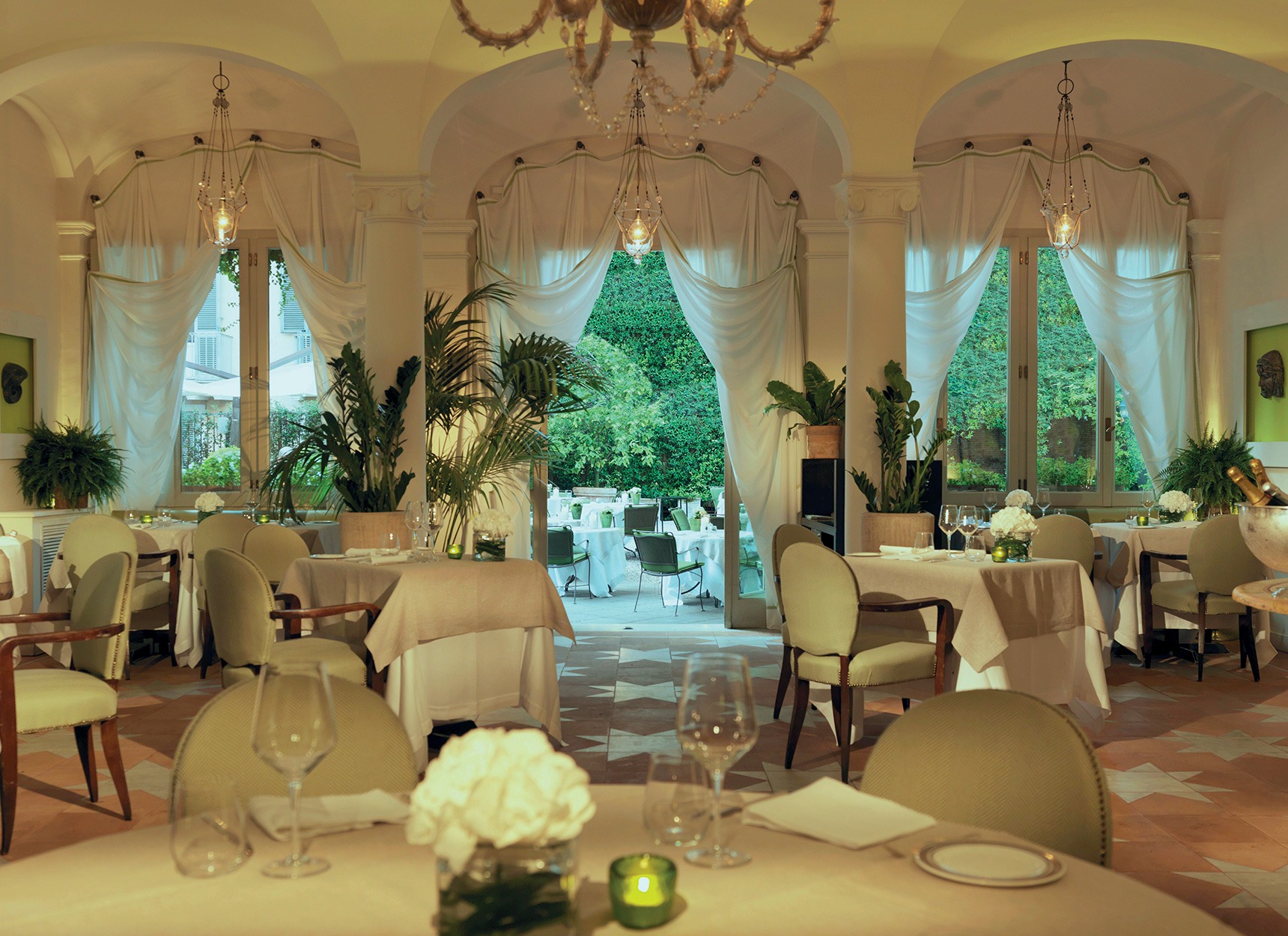 On y sirote le « Spritz maison » sur la terrasse du Bar Stravinskij. Et l’on savoure dans les hauteurs l’excellence de la gastronomie italienne tout en admirant à l’abri du soleil sous les orangers les tons rose et ocre des murs patinés. Les chambres élaborées par Olga Polizzi et l’architecte, Tommaso Ziffer, sont un mélange d’opulence, d’art déco et de Rome antique. Ils conjuguent à souhait coussins graphiques, meubles aux touches barocco design, marbre veiné et mosaïque de couleurs malachite. Chaque espace recèle d’objets soigneusement sélectionnés, créant une esthétique unique. Telles les sublimes suites, Picasso et Nijinski, véritables hommages aux artistes, qui possèdent en outre les terrasses les plus prisées avec vue imprenable sur les toits de la ville. Dans cette oasis de fraîcheur, l’expérience des thermes, dotés d’une piscine à jets d’eau mer où l’on se prélasse sous le plafond bleu étoilé de l’espace wellness, donne à jamais l’envie de devenir romain.