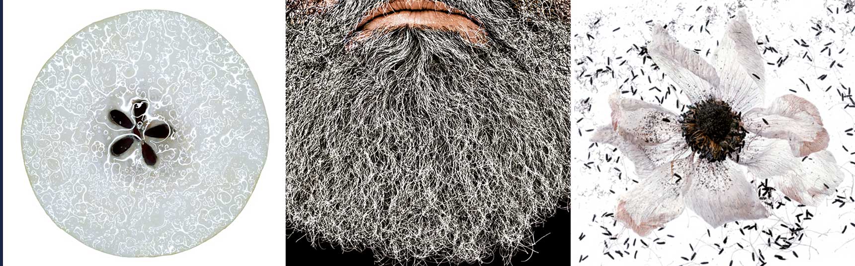 Exposer le cœur d’une pomme chinoise, d’une tomate noire. « Ces fruits et légumes mis à nu nous révèlent un monde de matières organiques et vivantes auquel seul l’esprit peut donner un sens ».