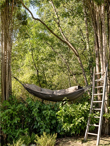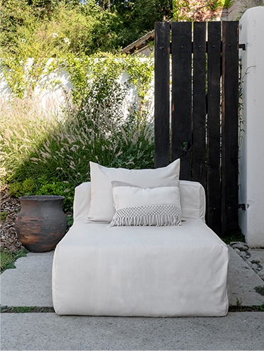 The brilliant idea of a hammock with the brand’s new product for the sunny days: “Oom”! Outdoor cushions and mattresses, 100% acrylic, in the “Garden” color that blends with the environment; “Cream” for the solo sofa.