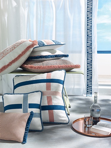 On XXL cushions, drapes, or daybeds, the “Palma” collection adds touches of color to outdoor spaces with its 100% acrylic thread that ensures colorfastness in light and resistance to weather, saltwater, and chlorine.