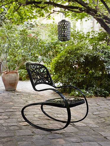 The “Signature” rocking chair, designed in hollow monobloc carbon, a patented French manufacturing process, features a seat and backrest also made of carbon fiber using a method of laying fiber strips on a mold.