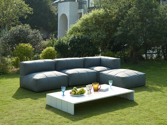 Aesthetics, form, and volume, signed by Sacha Lakic, make the fully upholstered “Apex” poufs an easy-to-integrate small seating option for any environment. Timeless, this season the “Mah Jong” sofa by designer Hans Hopfer is dressed in new Missoni fabrics designed for outdoor use.