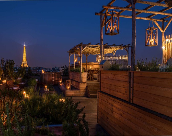 Premier hôtel du Groupe Evok,« Brach Paris » : un lieu de vie avec club de sport, bar, restaurant, potager et terrasse embrassant la Ville Lumière à 360°… Une philosophie avant-gardiste au design éclectique.